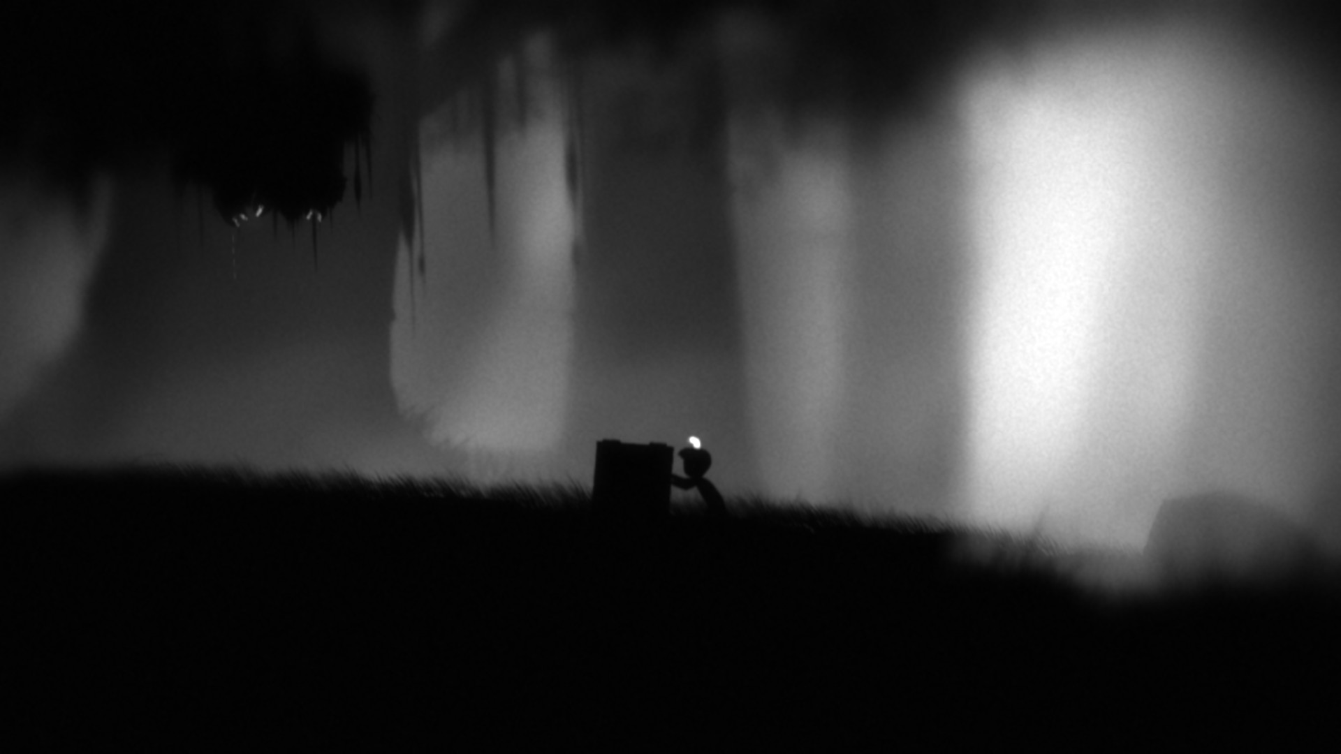 Fullerton mentions power-ups as one of the many resources found in games but fails to mention de-buffs, which begs the question of whether or not de-buffs should be classified as a resource or an obstacle. A unique element of Limbo that transforms the game’s movement rules is the mind controlling worm. This worm, shown resting on the boy’s head in figure 2, is an unavoidable de-buffs that forces the player to move in only one direction and prevents the player from coming to a stand still. Receiving this de-buffs forces the player to change their play-style by removing hazards before the worm controls them and managing their movement speed to avoid other hazards. The worm also opens access to two new resources for the player: light and the worm-eating creatures. If the player walks into a lighted area while possessed, the worm begins to burn in the sunlight and forces the player to change their direction. The player’s ultimate goal while possessed is to strategically change their movement direction with the light so that they can get close enough for the black creatures to eat the worm possessing them.