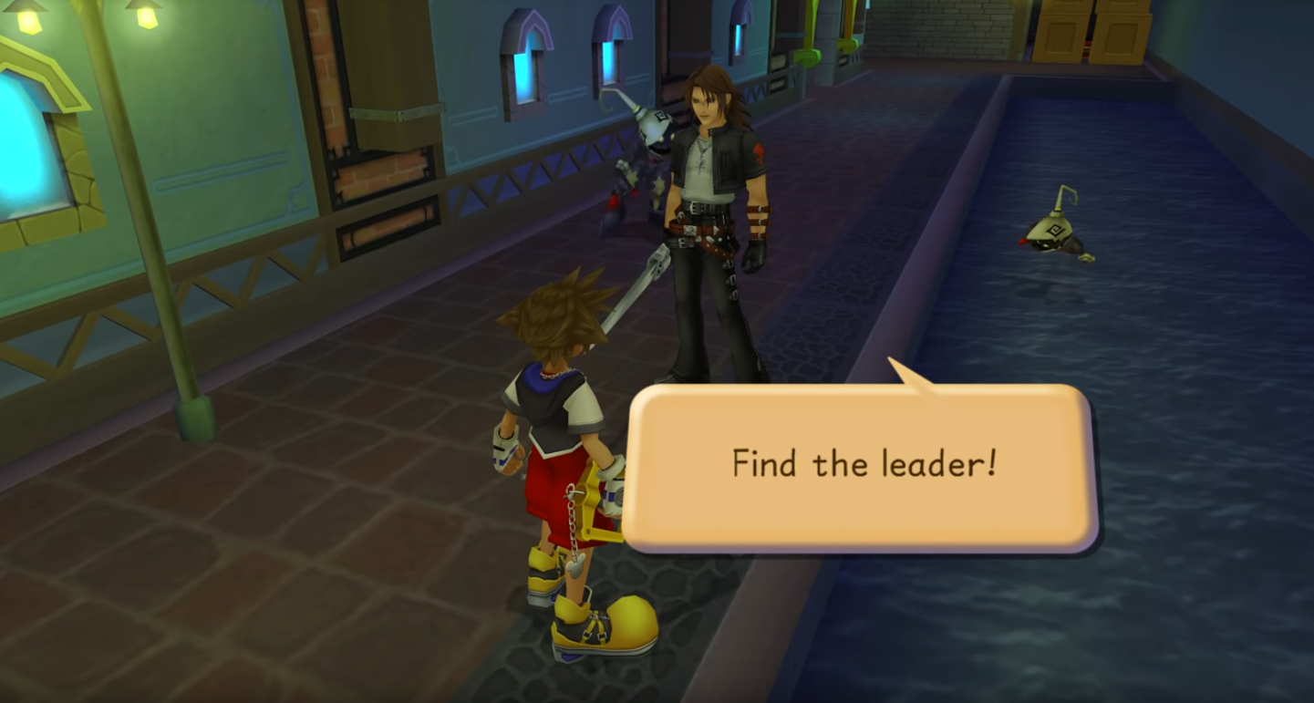 Cut-scenes are Kingdom Hearts’ preferred method of providing information to the player, but in addition to cut-scenes, it uses dialogue between characters to move the story forward. In Figure 2, the character Leon tells Sora to find the leader of The Heartless. From the information provided, players are able to deduce that they need to find and defeat a boss to continue through the story. By interleaving dialogue around cut-scenes, Kingdom Hearts presents their narrative without tiring the player with the same storytelling medium